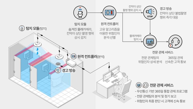 Alpha-C는 화장실 내 설치가능한 초소형·위장형 몰래카메라와 칸막이 상단 너머로 촬영하는 수법 등 모든 유형의 불법촬영을 24시간 365일 실시간 탐지하고 즉각 대응할 수 있는 시스템이다.